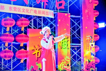 3月3日晚上,在东营区新区演艺广场,东营区的爱吕歌舞艺术团为附近的居民表演着精彩的现代舞和各种好听的戏曲。当晚,2015东营区“百姓欢乐大舞台”文艺团体汇演,精彩和歌曲和戏曲节目吸引着百余名居民前来观看。演员们冒着寒风献上一个个精彩的节目,得到居民的一致称赞。
