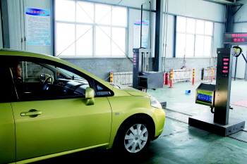 12日,东四路附近的天运机动车检测有限公司内,汽车正在接受灯光检验。