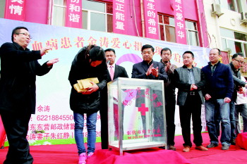 “只要人人都献出一点爱,世界将变成美好的人间!”3月14日上午,位于东营西城北一路的黄桷树川味酒楼门前涌动着浓浓暖意,由东营市红十字会、民建东营市委会、山东省四川商会东营(川渝)商会联合组织的“为白血病患者余涛爱心捐助启动仪式”在这里举行。山东省四川商会东营(川渝)商会领导、民建东营市委会领导、川渝老乡代表及社会爱心人士参加了捐款活动。在短短半个多小时时间里,从济南市中心医院赶来的余涛的妻子朱红静就收到了10多万元的捐款。