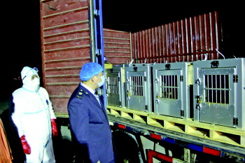 23日深夜,25只日本猕猴抵达东营。 本报记者 杨玉龙 摄