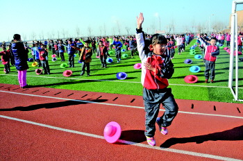 上午10点,东营区英才小学操场上,全校近400名小学生齐跳体育老师改编的《小苹果》,这支舞已经成为本学期孩子们最喜欢的“阳光大课间”趣味韵律操。