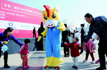 倒计时启动现场,赛事吉祥物赢赢和市民互动。(资料片)