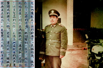 爸爸,您知道吗?您生前写在工作日记扉页上的“人民警察为人民”七个大字,早就镌刻在了我的脑海当中。您牺牲后,组织做出了这样的评语:“他短暂的一生中,对工作极端负责,对人民满腔热忱,为党和人民作出了许多有益的工作,不愧为一名优秀的共产党员、‘雷锋’式的模范人物。”爸爸,请您放心,我和姐姐将永远秉承“人民警察为人民”的理想信念,用我们的忠诚和汗水擦亮头顶的警徽。