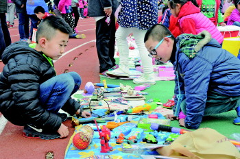 9日,春晖小学1900多名小学生齐聚操场,参加学校组织的“淘宝节”。不少小学生摆起了摊儿,变身“小老板”,一边吆喝一边卖货,也有不少学生来到这里淘宝,大家忙得不亦乐乎。 本报记者 段学虎 摄影报道