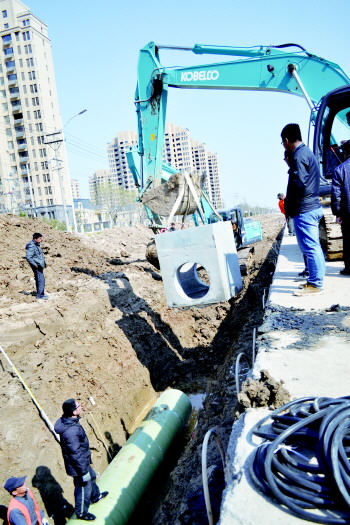 东四路改造工程中,工作人员正在安装污水管线。 记者 孙娜娜 摄