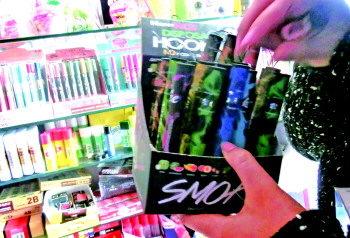 13日,记者走访东营市多所学校附近的商店,有不少商店都在卖唐先生所说的那种“电子烟”,不同的味道包装也不同,并且多个商家都把这种“电子烟”摆在一进门的显眼位置。