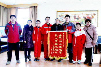不久,曲大爷和家人辗转打听到了周兵、王栋的姓名和工作单位。2月16日,为了当面向救命恩人表达感谢,老人在儿女们的陪伴下,驱车几百公里来到胜采二矿,送来了一面写有“舍己为人道德厚,救人危难风尚高”的锦旗。