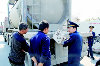 “你这罐子上怎么没贴剧毒标识?”在随后拦停一辆危化品运输车辆时,执法人员向驾驶员询问。驾驶员这才跑回驾驶室,翻出一个“剧毒”标识。“没有剧毒反光标识,无法引起周围车辆警惕,很可能会发生危险。”执法人员说,按照相关规定,将对其进行处罚。