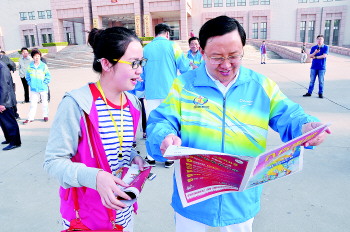 为给市民观赛提供更细致的服务,日前,本报出版了《八方来贺——2015年黄河口(东营)国际马拉松观赛指南》,并在比赛现场发放。东营市委书记、市人大常委会主任申长友对此给予高度评价,他从头到尾逐页翻看本报马拉松特刊,并不时与记者交流。