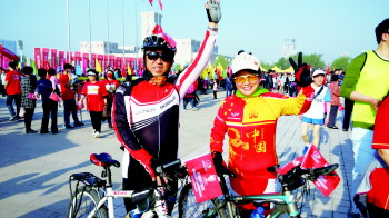 ◤骑友李先生和他的妻子。 本报记者 李玉亮 摄
