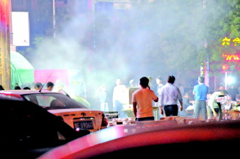 此时,店员也开始忙活起来,加木炭、摆好烤串、撒料、扇风,呛人的烟雾开始蔓延。几乎每个烧烤店都在烧烤炉前摆放风扇,将产生的浓烟抽到路上。其中一家规模较大的烧烤店,摆放了八九架风扇,不停地将油烟往外抽,“浓浓的油烟半里地外都能看到。”据张先生介绍,燕山路两侧大大小小的烧烤店有10余家,烧烤季一到,整个燕山路上比雾霾还严重,基本上看不清东西,两侧的居民根本不敢开窗。