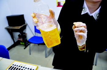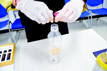 于高波首先向自来水中加入日落黄,轻轻摇晃矿泉水瓶,自来水变成了黄色。之后于高波加入酸味剂,柠檬酸和苹果酸。再加入甜味剂:阿斯巴甜、安赛蜜、甜蜜素。“这几种甜味剂能改善饮料的口感。”最后加入的是橙子味香精。将香精加入矿泉水瓶后,于高波摇晃矿泉水瓶,橙子味立刻从瓶口散发出来。