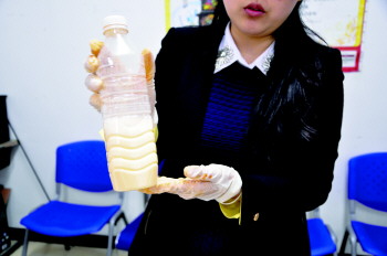 “最后是见证奇迹的时刻,让这杯饮料变成奶茶。”只见于高波向“饮料”中加入了二氧化硅和牛奶味香精。“饮料”立刻变成奶色,并有甜甜的牛奶香味。跟市面上销售的奶茶味道差不多。
