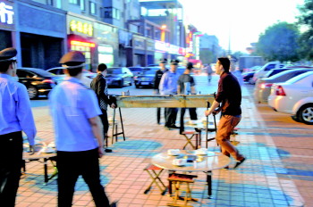 4日晚,东营市城市管理行政执法支队二大队对辖区内露天烧烤进行了整治,金辰美食街露天烧烤集中区域成为首个整治对象。据了解,接下来,城区内各个“狼烟四起”的露天烧烤区域将陆续开始整治。 本报记者 段学虎 摄