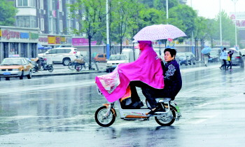 11日,东营街头出行的市民穿戴雨具穿行在雨中。降雨给市民出行带来的些许不便。