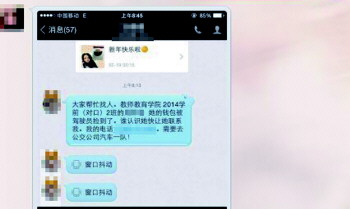 “公交公司汽车一队的一位司机是我的朋友,看到失主是东营职业学院的学生,就给我打电话,让我帮忙找一下。”东营职业学院学生牛文婧告诉记者,听说有同学钱包被3路公交车捡到,她立刻编辑了一条内容为“大家帮忙找人,教师教育学院的小周,她的钱包被驾驶员见到了。谁认识她快让她联系我,需要去公交公司汽车一队”的信息,发送到了学校、学院的各大QQ群里,并在自己的朋友圈、QQ空间也进行了发布。