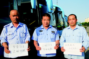 公交车驾驶员代表举着自写的拒绝“路怒”宣言,希望以这种方式倡议司机加入“文明行车”活动中来。