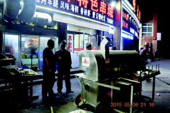 海河路上的一家利用无烟烧烤炉作掩护使用传统烤架烧烤的业主接受检查。 通讯员供图