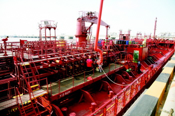 一艘名为索加翡翠号的外轮缓缓停靠东营港2万吨级码头。 通讯员 陈仕钊 摄