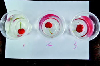 记者在农贸市场中分别购买了3种樱桃,价钱分别为8元、8元、12元。编号分别为样品1、2、3。3种樱桃的产地均为青岛,品种为“红灯”。用电子秤称取2克食盐于透明杯中,倒入自来水搅拌至食盐溶解,之后,加入50克樱桃开始浸泡。半小时后,3个实验样品中均未发现蛆虫。