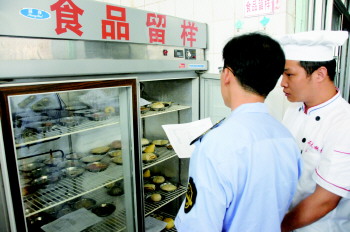 检查人员对高中食堂的食品留样进行检查。 本报记者 段学虎 摄