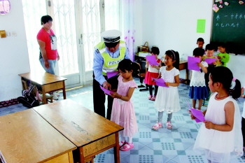 为预防和减少各类交通事故的发生,从源头上预防和减少道路交通事故,在“六一”节来临之际,河口交警民警走进辖区幼儿园进行交通安全宣传教育,受到老师和小朋友们的欢迎。