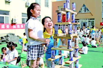 广饶县渤海大地幼儿园的小朋友参加大型积木搭建活动。