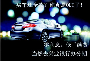 兴业银行信用卡分期付款购车,12期、24期、36期不限车型任意选,零利息,手续费低。审批流程快。让您提前实现购车梦想!