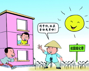 去年10月底,石家庄二十四中的新教学楼投入使用,准备做校园绿化时,校领导决定种冬小麦。刚种的时候,有的学生还以为是韭菜。副校长说,让学生认识一下农作物,也感知一下它们的生长!收割机走进校园收割小麦,学生说,“简直就像自己种的麦子要收割一样。