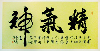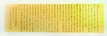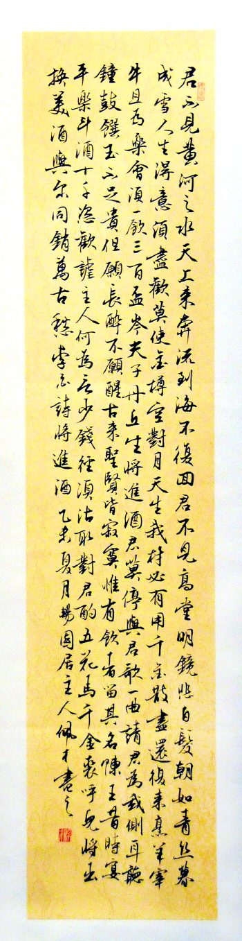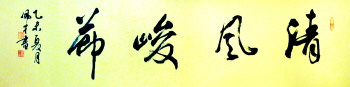 郧佩才的行书作品则又透露出不同的气象,行云流水中作品浑然天成,其作品中自己结构规范中带有变化,笔法走势成熟中透出创造,一幅长卷中绝找不到相似之处,笔法变化莫测,却又融为一体,一股灵动之气跃然于纸上。