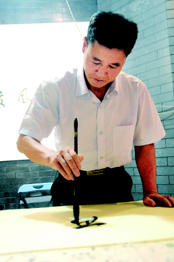日前,应东营千善助学中心要求,郧佩才先生为该中心挥毫泼墨,创作了数幅作品用于慈善。初见郧先生,沉默少言,不苟言笑。但一旦手触笔杆,饱蘸浓墨,挥洒自如。与一些人不同的是,不论是行书,楷书,郧佩才都会一丝不苟的完成,用笔认真、严谨。但一幅作品完成,丝毫看不出拘谨,反而透出一股浩然之气。