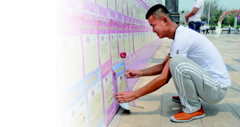 现场,一位小伙将一束玫瑰放到自己海报上,想更吸引女生注意。