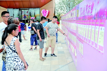 本报8月23日讯(记者 宋贝贝) “只是因为在人群中多看了你一眼,再也没能忘掉你容颜……”缘分或许就是这样突如其来、出其不意,人群中不经意的一瞥,便能展开一段浪漫爱情之旅。21日到23日的东营万达广场营销中心分外温馨,处处洋溢着甜蜜的味道,单身男女在这里邂逅爱情。23日,“浪漫七夕 爱在万达”相亲会就在这醉人的氛围中落下了帷幕。