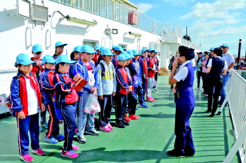12日,一群小学生来到东营港,参观了东营旅顺航线“长山岛”号客滚船,学生们不仅参观了驾驶厅,了解各项设施的用途,还学习了水上安全注意事项。最后与客滚船合影留念。