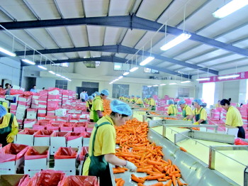 图为车间工人正在对出口胡萝卜进行分级。 本报记者 张婧婧 通讯员 于雪燕 摄影报道