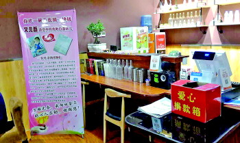 ▲一面馆发起“你吃一碗面,我捐一块钱”活动,并设立爱心募捐箱。该店的经营者称,将会把筹集到的所有善款交到小鹤轩母亲的手中,用于小鹤轩的医疗费。