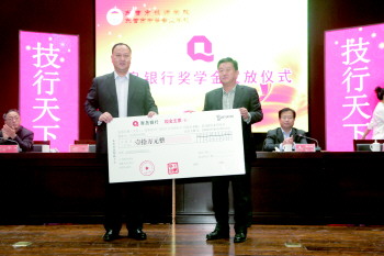 青岛银行东营分行向技师学院捐赠下一年度的奖学金支票。