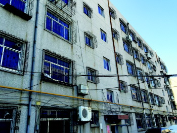 一小区内住户安装着老式钢筋外挂式防盗窗。