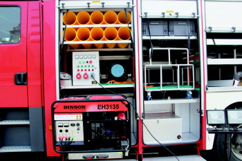 新购置的金盾抢险救援消防车由国内大型专业生产厂家上海金盾特种车辆装备有限公司制造,集照明、供电、牵引、吊机、防护功能为一体。该车总体布局合理,配有德国进口底盘,且器材箱为优质钢型结构,采用铝合金材料制作,配备车载发电机、照明升降杆、发电机电控柜及各类抢险装备和器材,设有器材专用托板、托架、抽屉等,取用器材方便快捷。该车配置的随车起重机、牵引绞盘、升降照明发电系统,为官兵及时快捷的处理各种突发性抢险救援事故提供了可靠的装备支持。