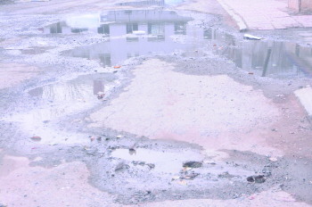 ▼河口区河运小区内地面坑洼不平,来源不明的污水流了一地,在地面坑洼处污水聚集成积水坑,臭气扑鼻。 本报记者 解岩 摄