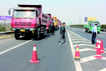 3月21日中午,东营高速交警支队二中队组在辖区收费站整治时,接到监控中心“视频巡逻”播报,东营南收费站入口多辆重型自卸货车涉嫌违规上高速。二中队民警接报后火速出警,成功拦截15辆涉嫌违章的重型自卸货车。