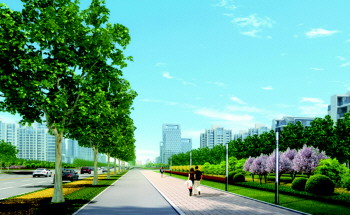 ◥胜利大街奥体路至海河路段绿化完成后效果图。