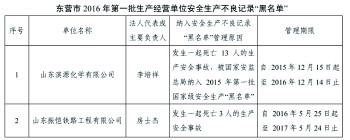 两家被纳入黑名单的企业被“拉黑”的原因分别是,山东滨源化学有限公司发生一起死亡13人的生产安全事故,被国家安监总局纳入2015年第一批国家级安全生产“黑名单”,管理期限为,自2015年12月15日起至2016年12月14日止;山东振恺铁路工程有限公司发生一起死亡3人的生产安全事故,管理期限为,自2016年5月25日起至2017年5月24日止。
