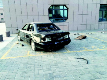 记者注意到,该小区的路比较窄,如果路边停满车辆,又恰巧有两辆车在此处相向而行时,其中一方只能跨到路肩上避让,通行十分不便。僵尸车的存在无疑让这种不便更加严重。另外,在集萃苑小区东门,记者还看到了王先生所说的另一辆僵尸车。这是一辆老款奥迪,左右侧车窗玻璃和后玻璃都不复存在,车胎也已经瘪掉,却斜着跨在两个车位之间。