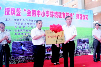 活动现场,中国野生动物保护协会副秘书长李青文宣读授予东营市“中国黑嘴鸥之乡”荣誉称号并现场授牌。李青文介绍,东营市政府近几年在自然保护区的生态修复和公众教育等方面所做的工作卓有成效,黄河三角洲成为黑嘴鸥全球第二大繁殖地,到2015年增长至5330只,占全球种群数量的37%。“中国黑嘴鸥之乡”的称号实至名归。此后,环保部宣教中心与东营市政府相关负责人现场为全国中小学环境教育社会实践基地揭牌。