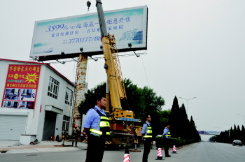近日,城管执法人员对东营区西城某处大型违规户外落地广告牌进行拆除,为了确保安全,执法人员对拆除现场实施警戒作业。据了解,按照全市拆违治乱总要求,区城管局正在对全区违法建设及大型违规户外落地广告牌进行集中拆除活动。全区摸排违规广告牌353处,目前已经拆除267处,在整治过程中,执法人员以宣传为主,坚持公平、公正、公开的原则,制定了拆除方案,确保拆违活动顺利进行。