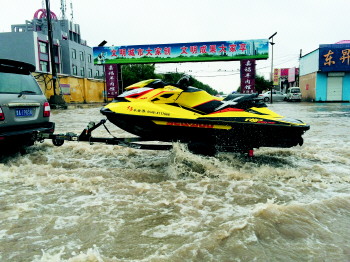 7日下午,记者乘车途经西二路积水路段时,看到一辆suv拖着一辆摩托艇在公路上前进,由于积水太深,摩托艇下的拖车轮已近淹没。