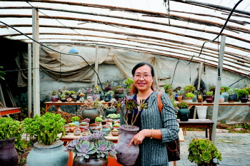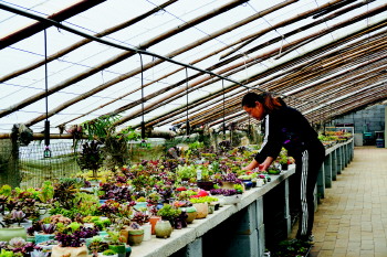 ◥顾客在孟孟多肉大棚里挑选自己心仪的多肉植物。
