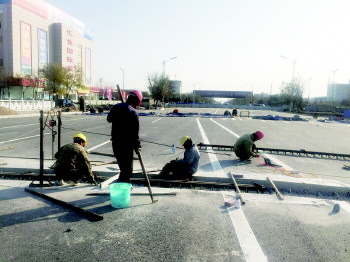 15日下午,工人正在进行伸缩缝填充施工。 本报见习记者 赵环宇 摄