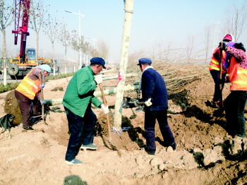 在东青高速西侧绿化提升工程现场,工作人员正在将刚运来的白蜡行道树进行栽植,据现场负责人介绍,目前黄河路两侧的绿化整形已经完成,基本能看到一个轮廓,另外绿化提升工程中的公厕、木栈道等已经进入了基础建设阶段。“这一处绿化提升工程的实施,不但提升东青高速两侧的绿化景观,提升东营城市形象。更重要的是,也为东营市民提供了一处可以休憩游玩的城市绿园。木栈道、环卫工工作站、公厕、停车场等设施一应俱全。”